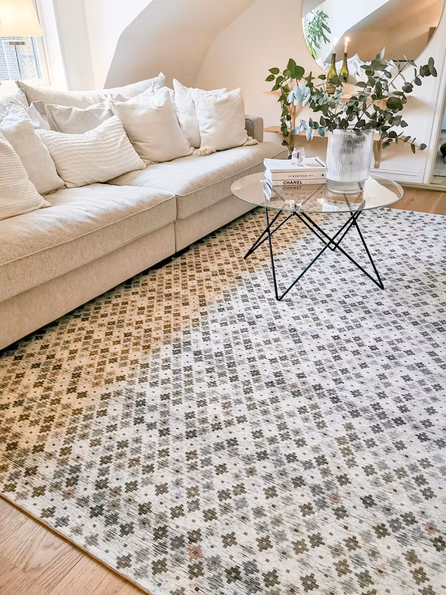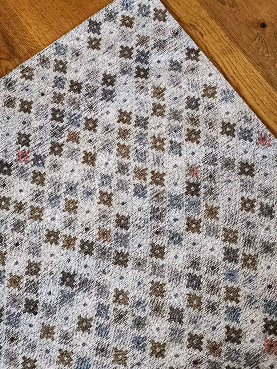 Jenna Multi är en jacquardvävdmatta som är tillverkad av tre olika typer av garner. Den tunna akrylen ger mattan ett tydligt och detaljerat mönster, medan polyestern ger en otrolig fin lyster. Kombinationen av dessa två garner tillsammans med bomull ger mattan en mjuk och skön känsla, vilket gör den till en av våra mest populära kvaliteter. Marreke är en premium matta av högsta klass som tillverkas i Belgien, Europa. Belgien är känt för sina kvalitetsmattor. Jenna Multi är en lättskött matta som är enkel att hålla ren. Den tunna strukturen gör den lättdammsugare, och vid fläckar rekommenderar vi att man fuktar en trasa i varmt vatten och blandar det med ett milt rengöringsmedel som Grön Såpa. Kläm ut lite av det blandade vattnet ur trasan, dra försiktigt trasan över fläcken och torka sedan upp det med hushållspapper. Detaljer & skötselråd: - Material: 52% akryl, 29% polyester, 19% bomull - Baksida: Halkfri baksida med en blandning av polyester och bomullsmix - Typ: Maskinvävd - Tjocklek: Ca 8 mm - Tvättråd: Fläckar kan avlägsnas med en ljus frottéhandduk, lite ljummet vatten och milt rengöringsmedel. För tvätt av hela mattan rekommenderas fackmässig tvätt.