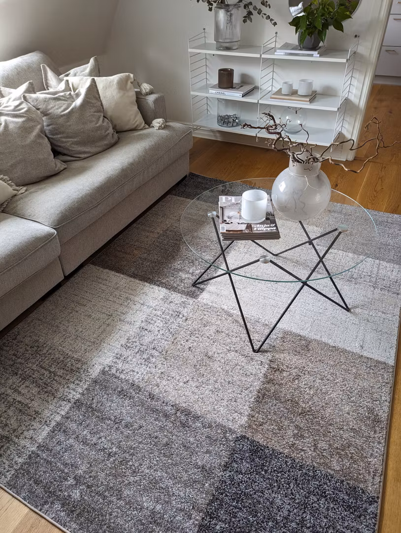 Mattan pryds av ett blockmönster som påminner om ett lapptäcke, med mjuka rutor i grå nyanser kombinerade med naturliga toner som creme och linne. Den neutrala färgskalan gör Grand Boxes till en lättplacerad matta som smälter in perfekt i såväl moderna som klassiska inredningar.